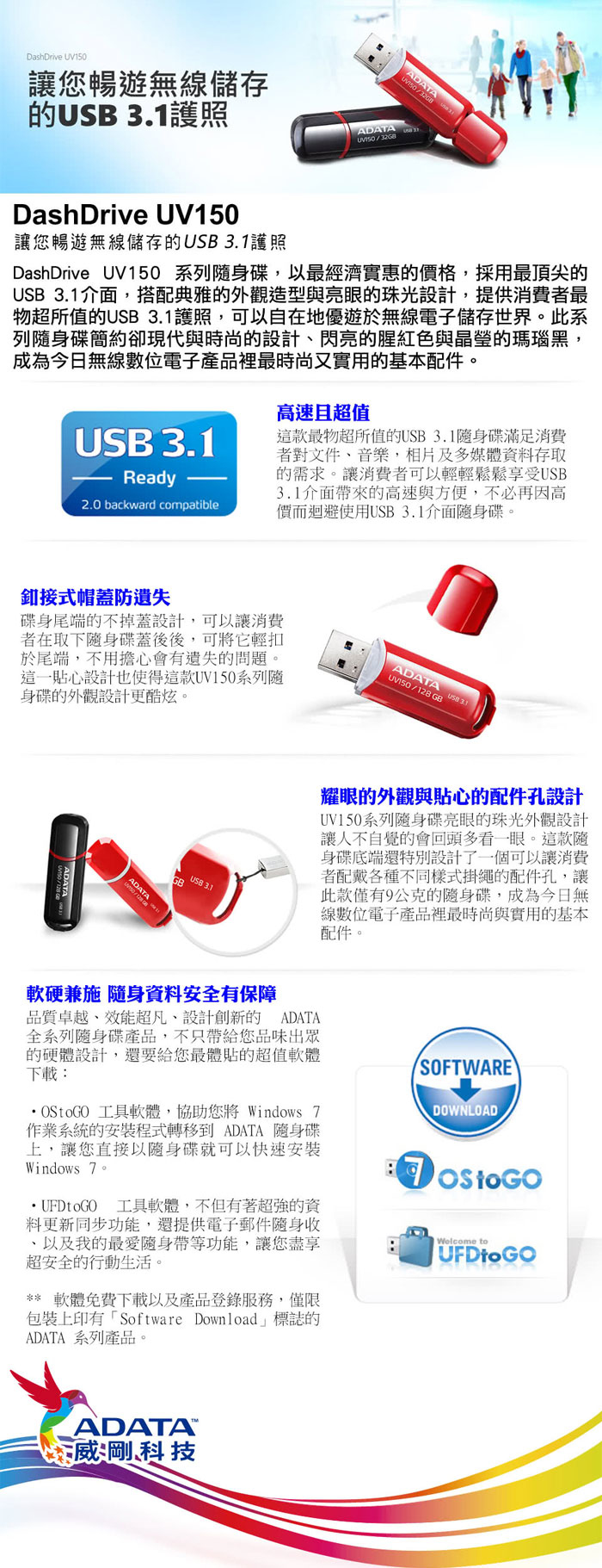 《限量》威剛 UV150【釦接式帽蓋 / USB3.2 Gen1 / 黑 / 紅】32G 隨身碟