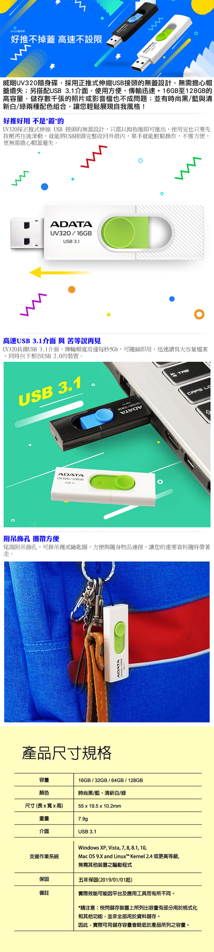 《限量》威剛 UV320【姆指正推式 / USB3.2 Gen1 / 黑 / 白】128G 隨身碟