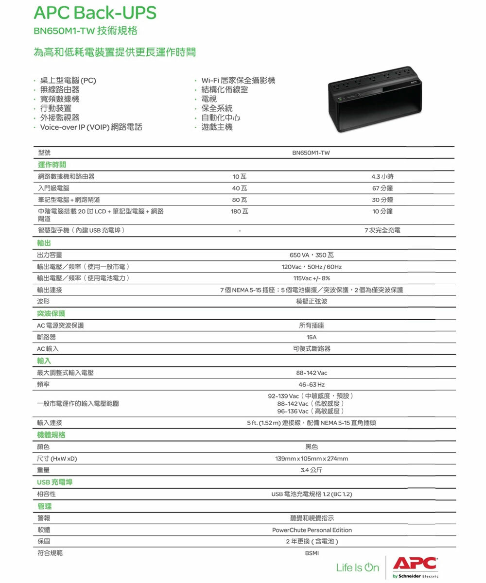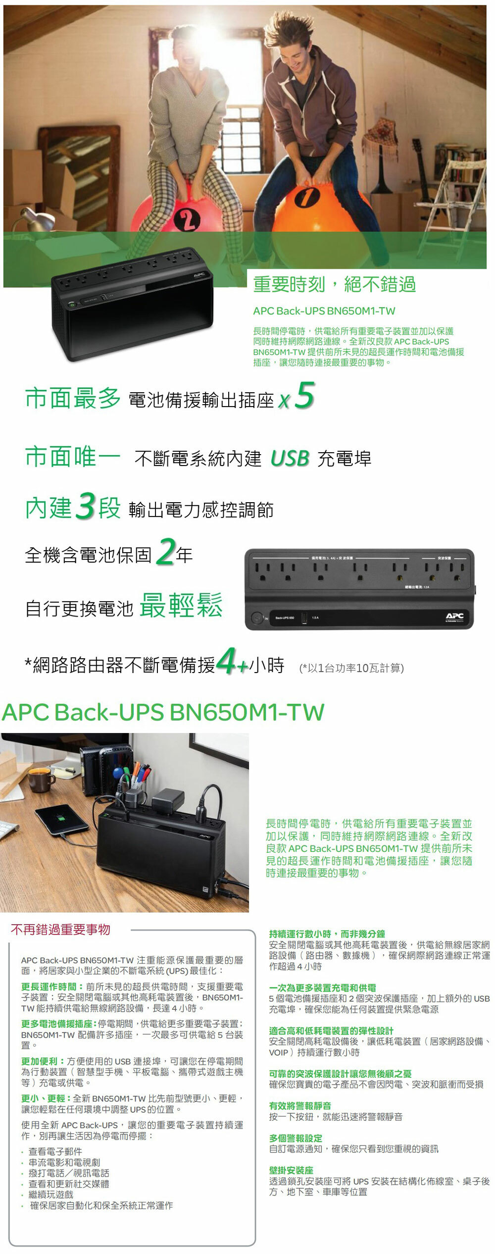 全新改良款APC Back-UPS BN650M1-TW提供前所未見的超長運作時間和電池備援插座,讓您隨時連接最重要的事物