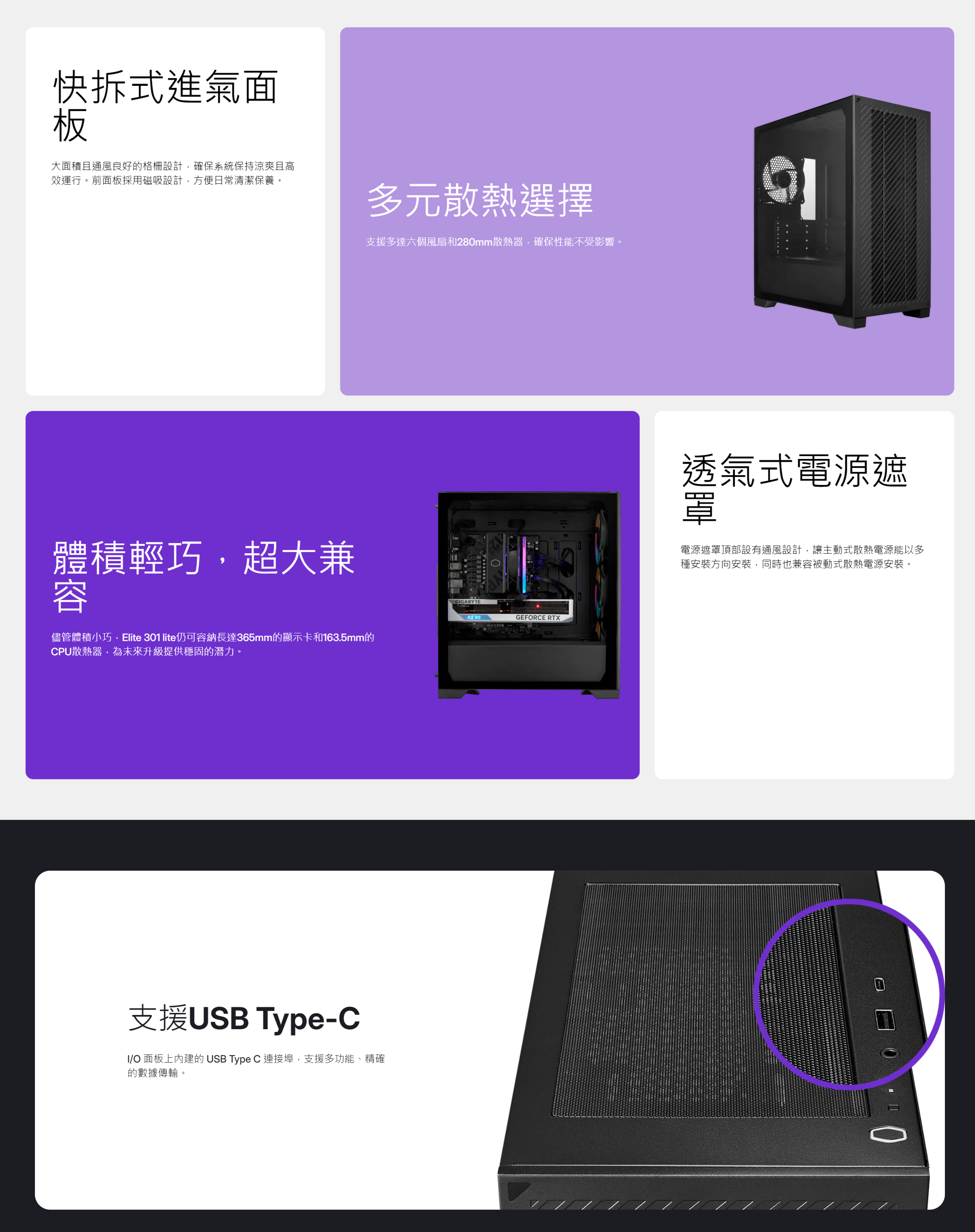 Elite 301配備了一個大面積且通風良好的進氣艙,確保系統保持涼爽且高效運行。採用全黑色烤漆,電源遮罩讓您的電線不凌亂、整線便利,既實用又吸睛。