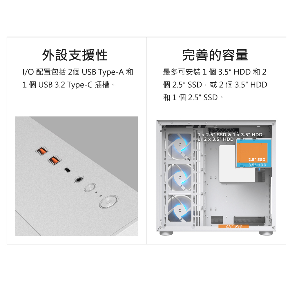 2.5" 硬碟槽:1+1 (由3.5"硬碟槽轉換)