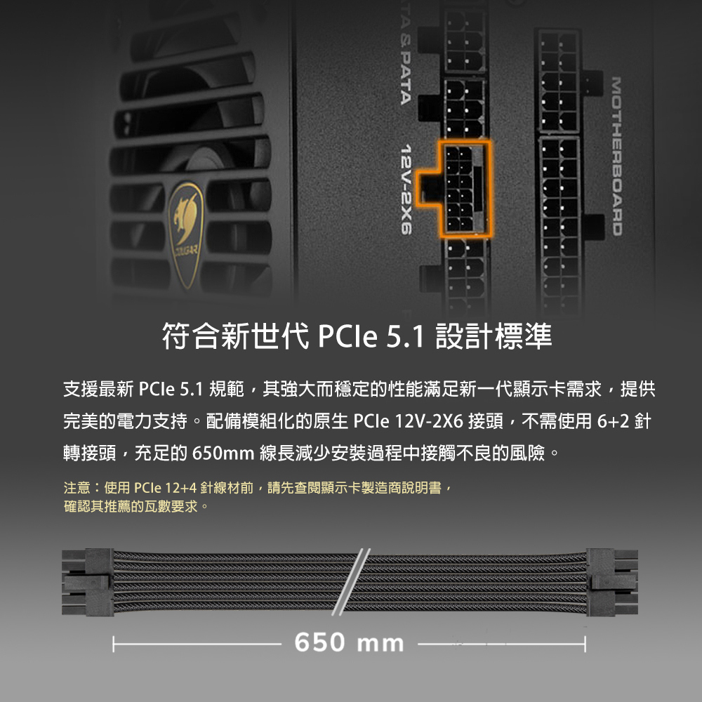 支援 PCI Express 5.1 顯示卡,配備 12+4 針接頭,實現真正 200% 動態電力輸出。