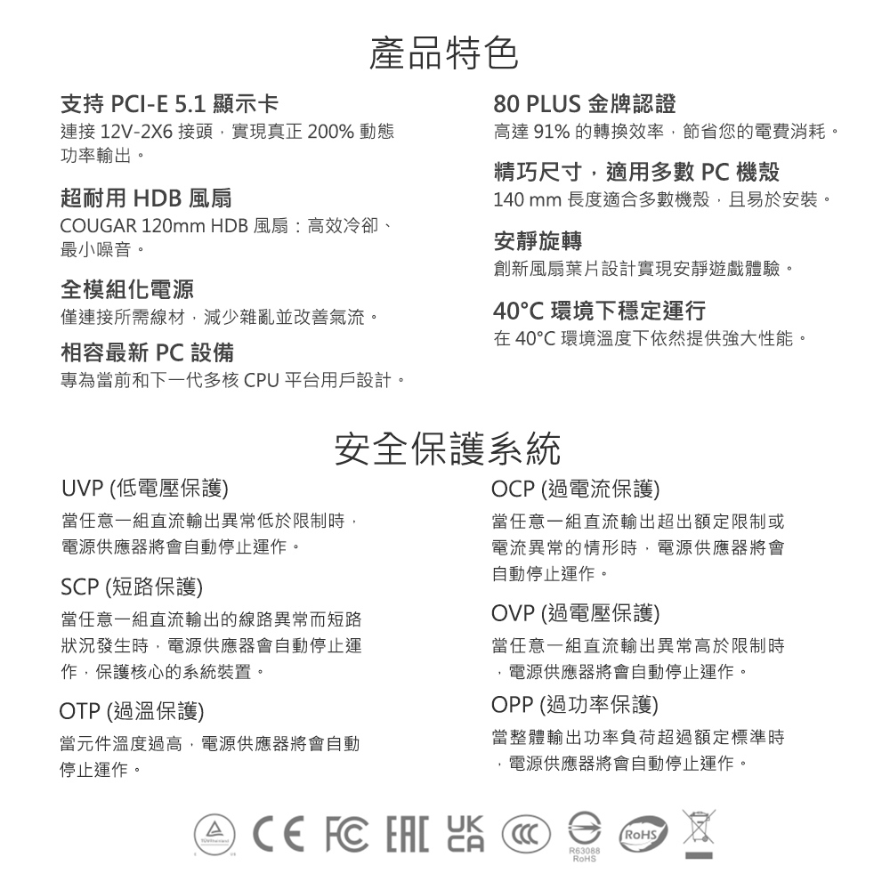 115V 獲得 Cybenetics 金級認證,230V 獲得 Cybenetics 白金級認證。(限850W型號)