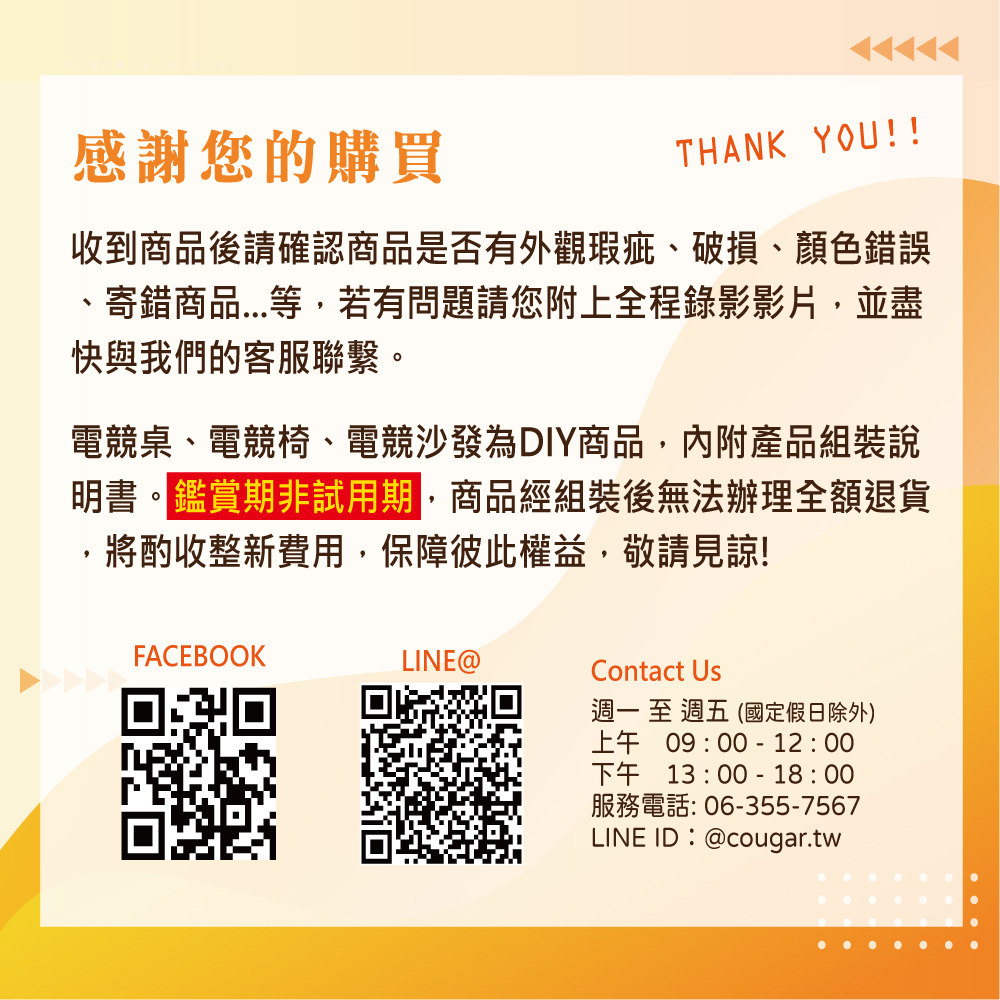 2.如組裝後不滿意想辦理退貨,因本系列產品部分零件是一次性組裝,無法回收使用,需要自行負擔此零件費用和產品整新費用。