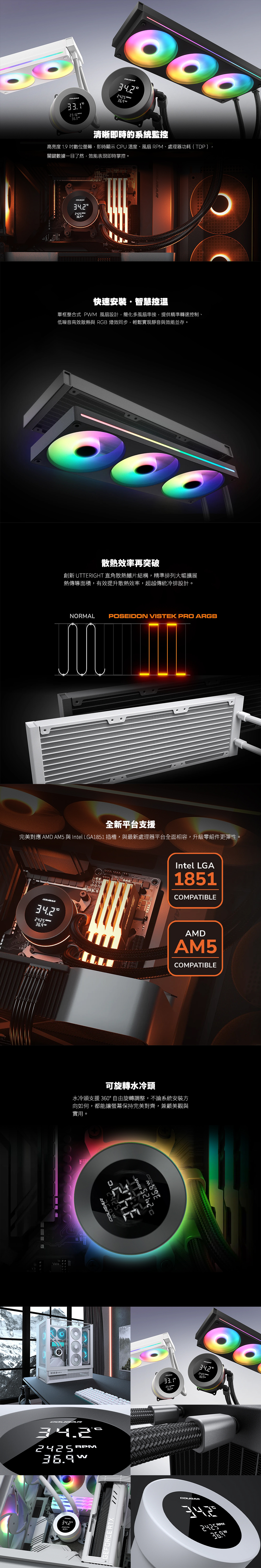 • 360° 自由旋轉水冷頭,顯示方向完美對齊,不受安裝角度限制。