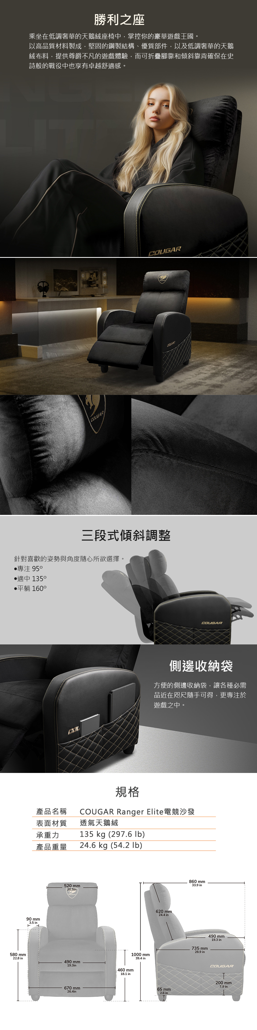 絨布料,提供尊爵不凡的遊戲體驗,而可折疊腳靠和傾斜靠背確保在史