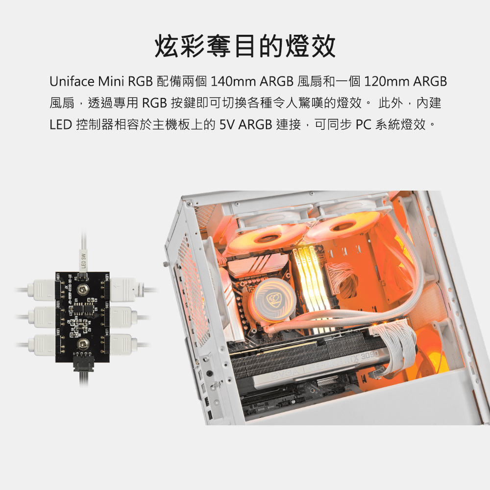 內建 LED 控制器相容於主機板上的 5V ARGB 連接,可同步 PC 系統燈效。
