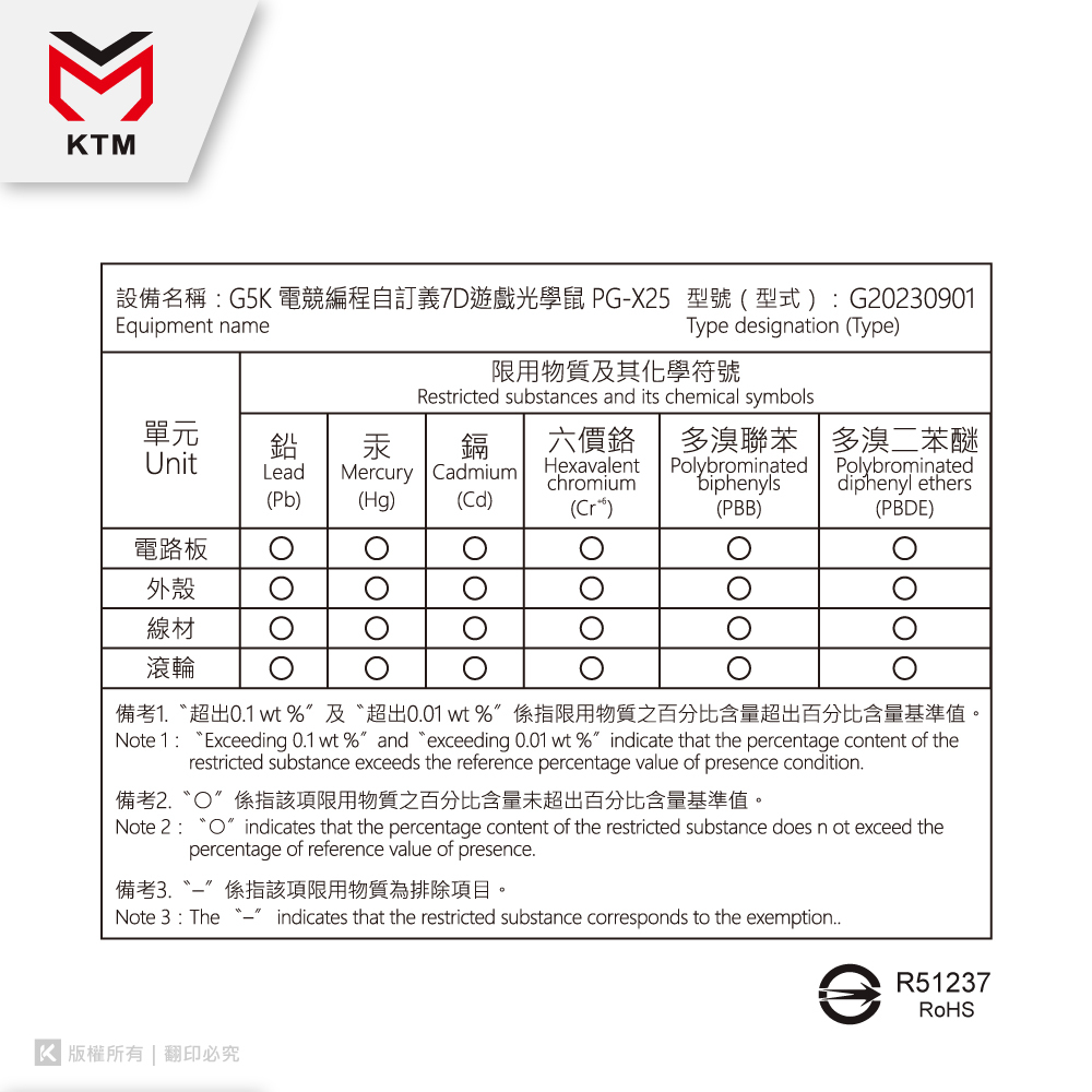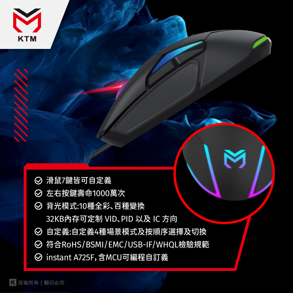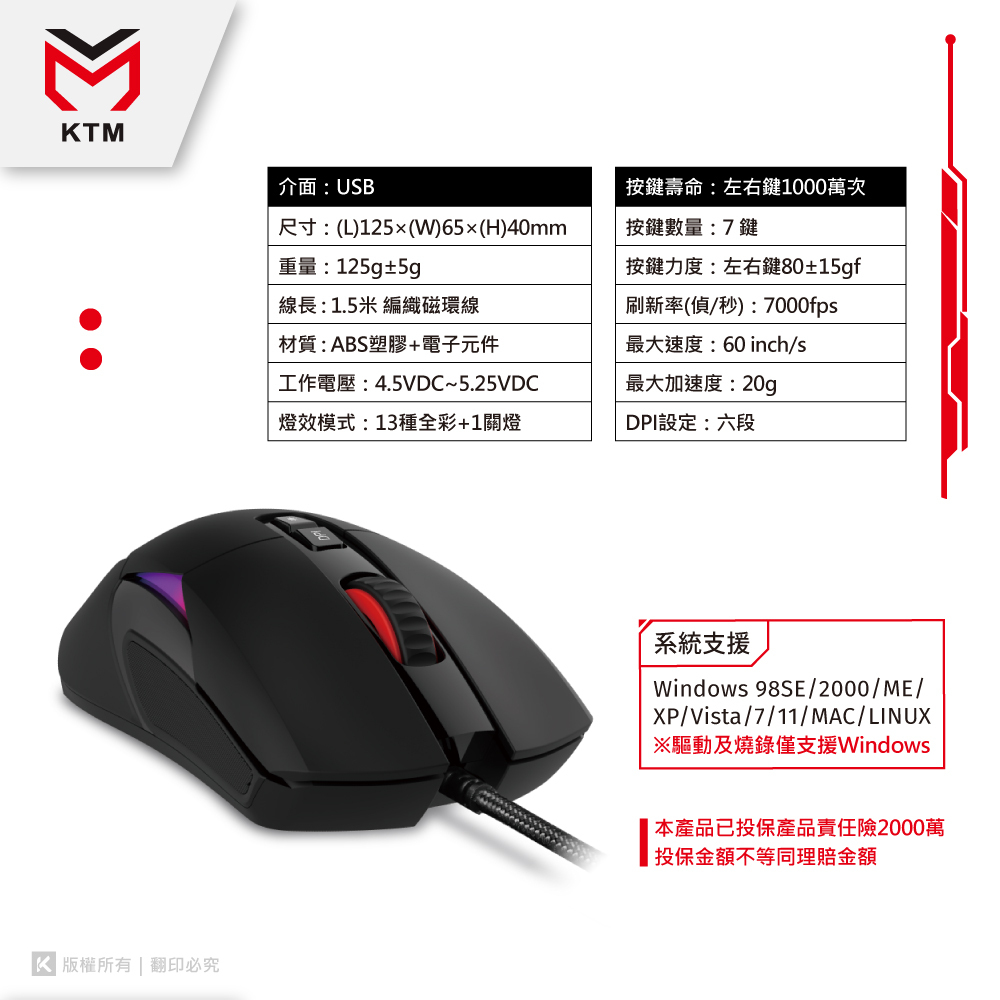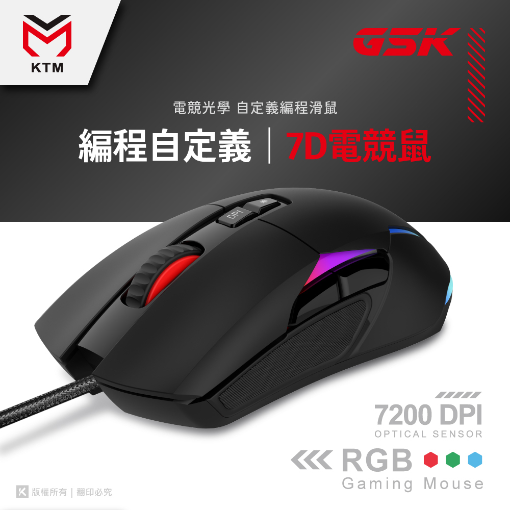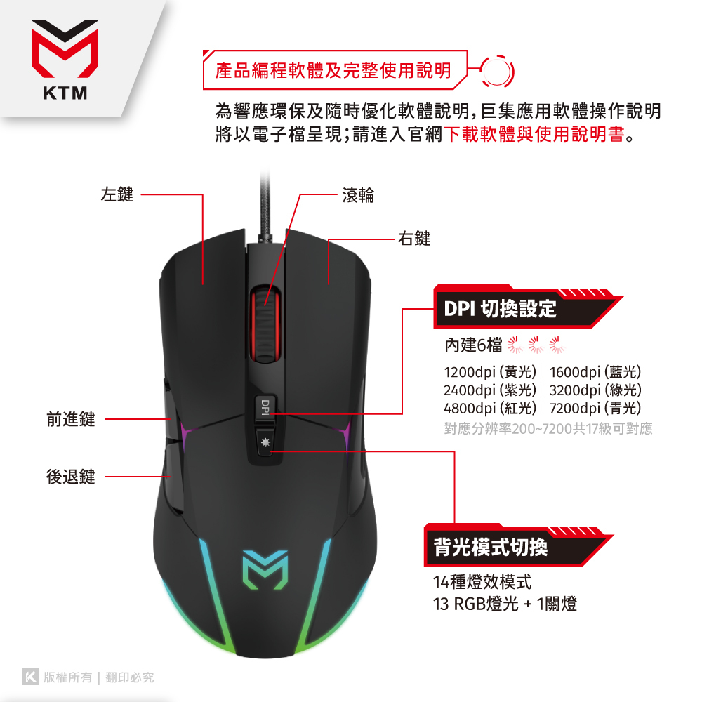 G5K電競光學自定編程滑鼠7200DPI 背光模式:10種全彩、百種變換 最大幀率 7000fps,最大速度 60inch/s,最大加速度 20g