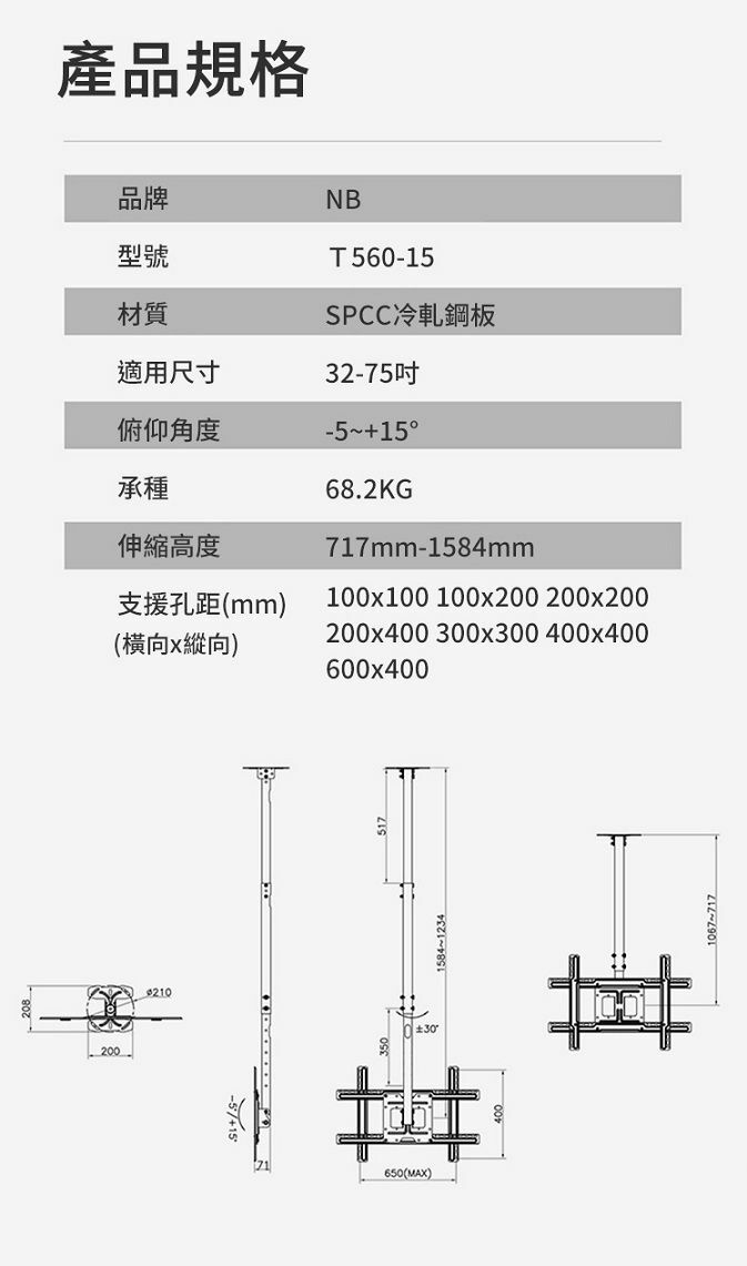 【到府安裝可詢價】NB T560-15 適用32-75吋 懸吊式液晶電視螢幕架 天花板吊架 天吊架 門市商店掛架 懸吊架 電子菜單架