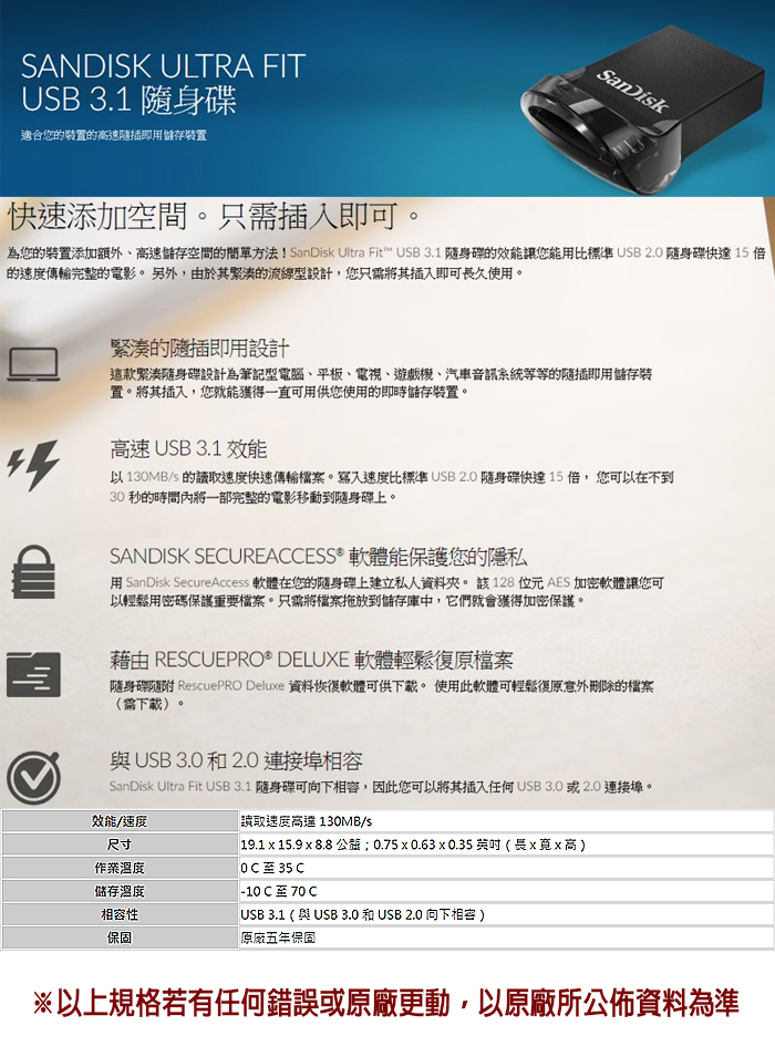 相容性:USB 3.1(與 USB 3.0 和 USB 2.0 向下相容)