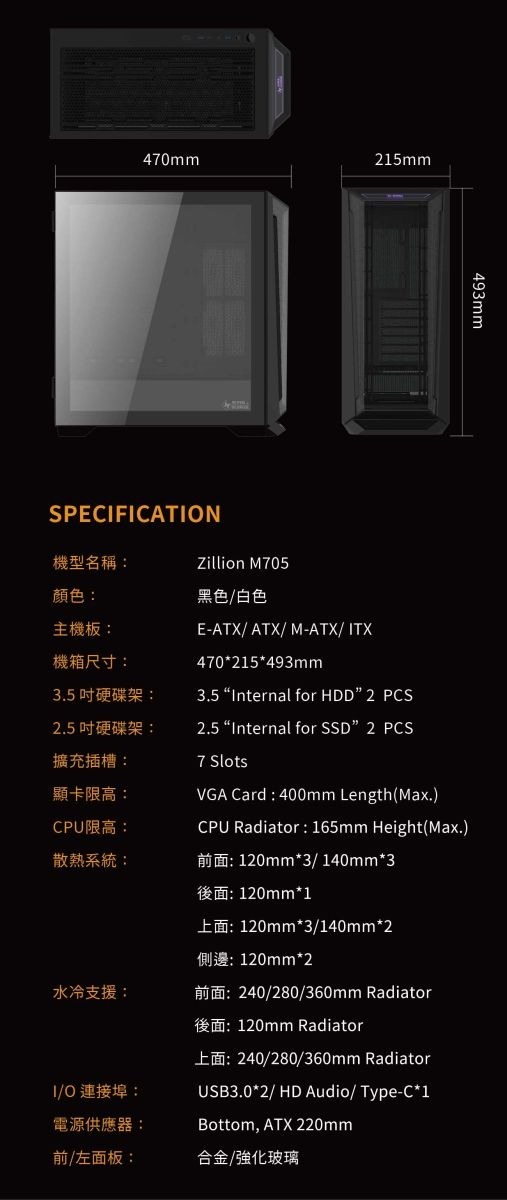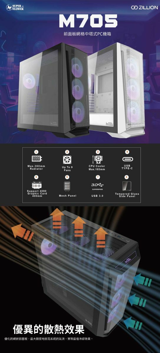 SUPER FLOWER 振華 Zillion M705 玻璃透側 機殼 附ARGB風扇4顆 黑色