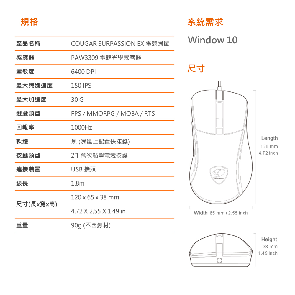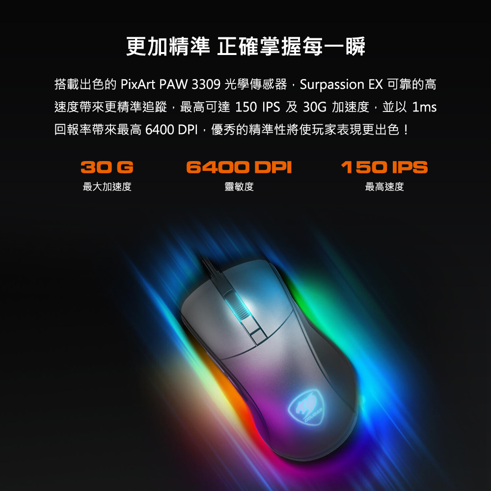 COUGAR 美洲獅 Surpassion EX 人體工學 RGB 電競滑鼠 福利品