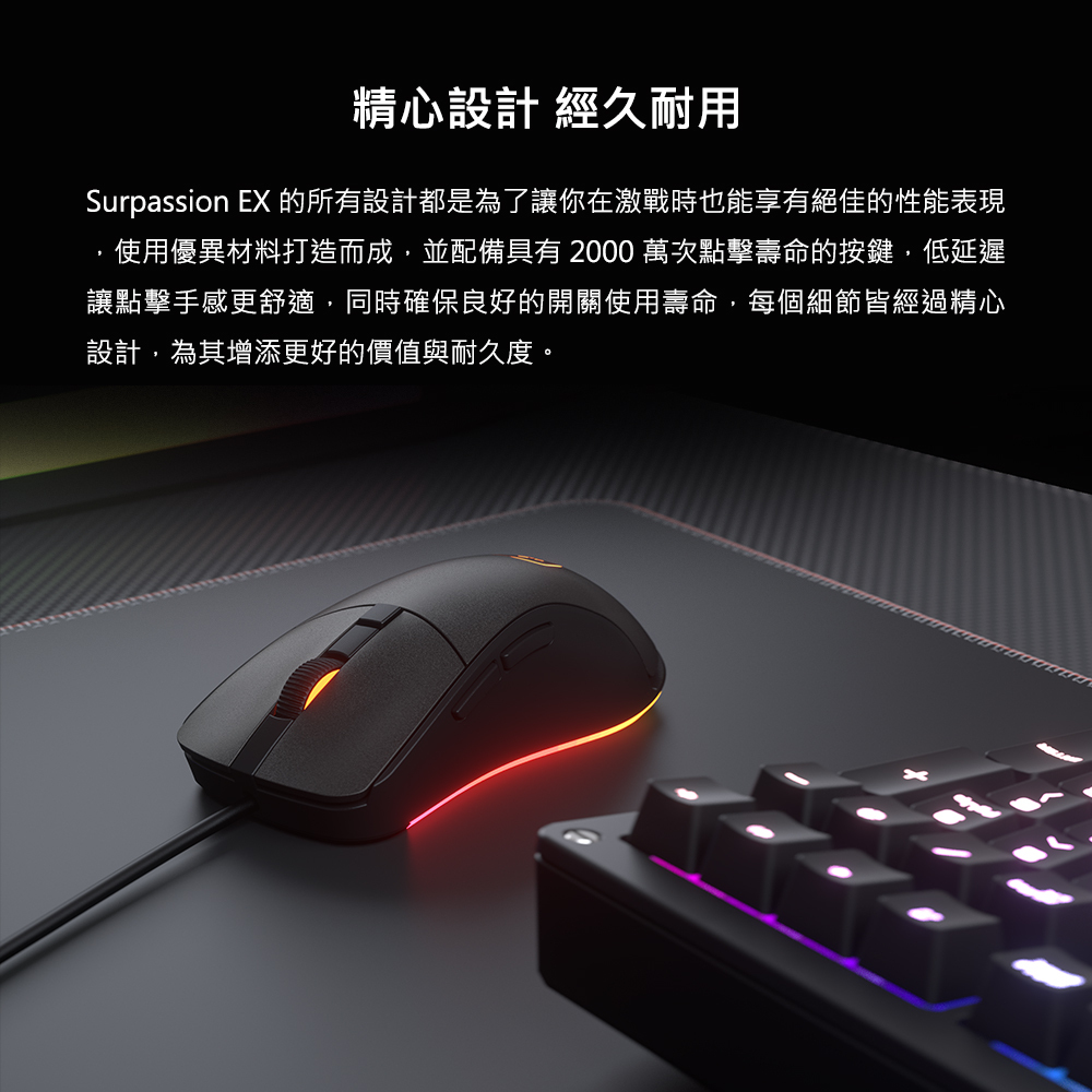 Surpassion EX 兼具人體工學與強大功能的電競滑鼠,搭配 RGB 燈效,提供舒適遊戲體驗。