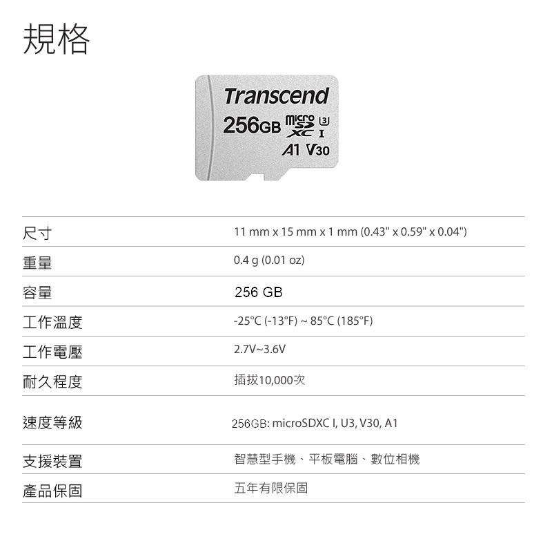 《限量》創見 Micro-SD / TF 256G【Class10 / U3 / 100M / 附轉卡】(300S-A)