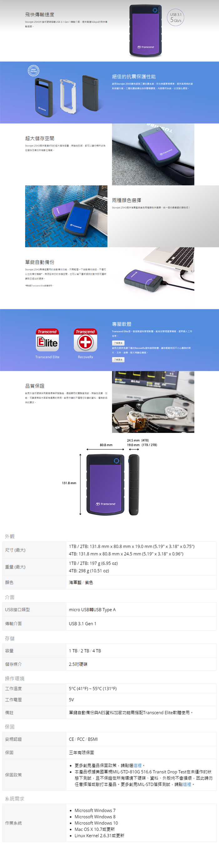 創見 25H3P 1TB 軍規防震【紫】USB3.0
