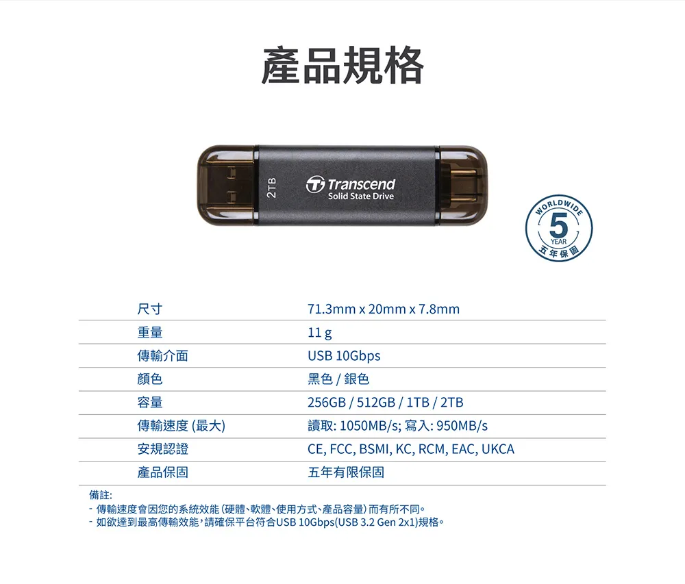 如欲達到最高傳輸效能,請確保平台符合USB 10Gbps(USB 3.2 Gen 2x1)規格。
