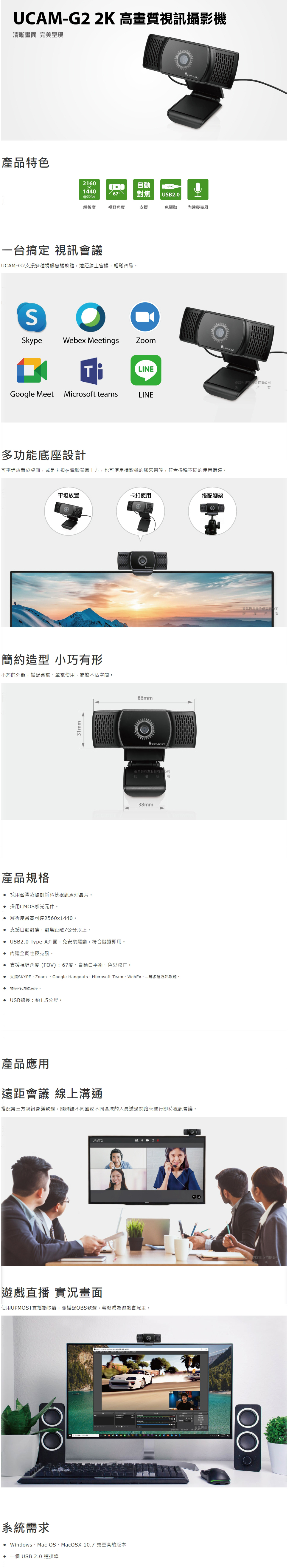 (客訂) UPMOST 登昌恆 UCAM-G2 2k 視訊攝影機 補課 直播 免驅動 支援多種視訊會議軟體