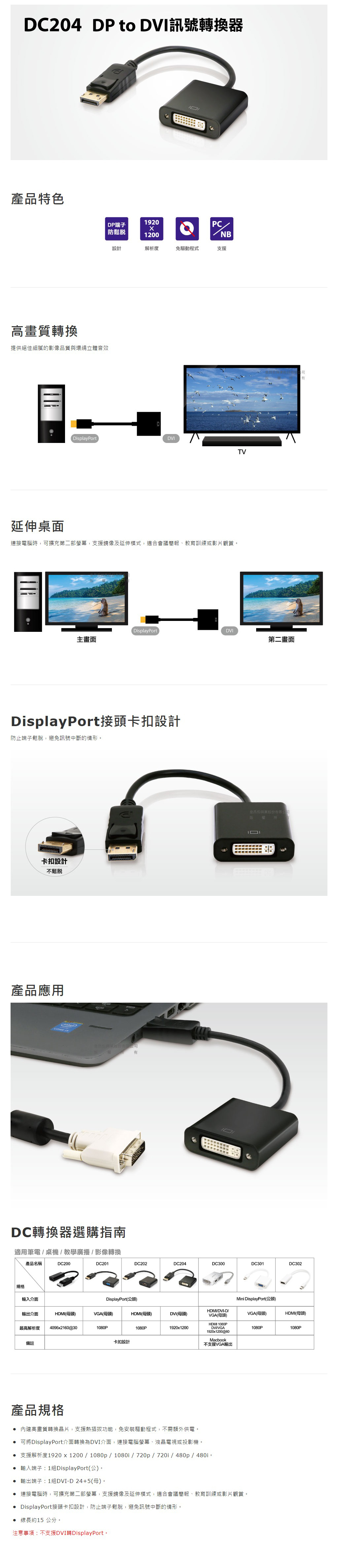 •可將DisplayPort介面轉換為DVI介面,連接電腦螢幕、液晶電視或投影機。