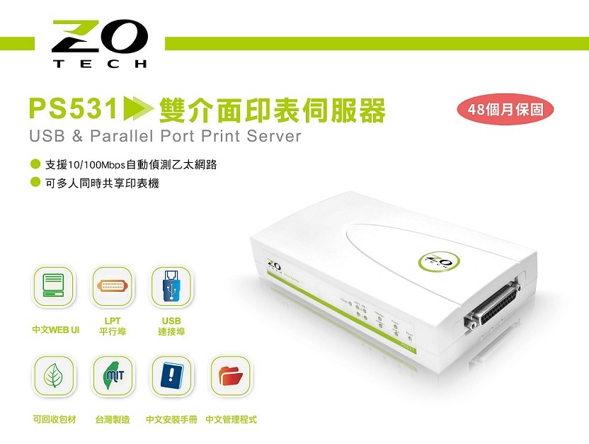 產品特點 : PS531 雙介面印表伺服器,具備 10 種列印方式及網路管理,能夠將傳統平行埠(Parallel)、USB埠印表機,透過RJ45乙太網路介面連到網路上,讓所有的使用者都能夠同時分享印表機的列印資源。